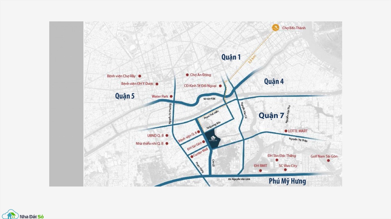 - Từ căn hộ di chuyển sang quận 1 chỉ 2.5km. Sang quận 7 chỉ 3.5km. Sang quận 3, quận 5, quận 10 chỉ 2km.