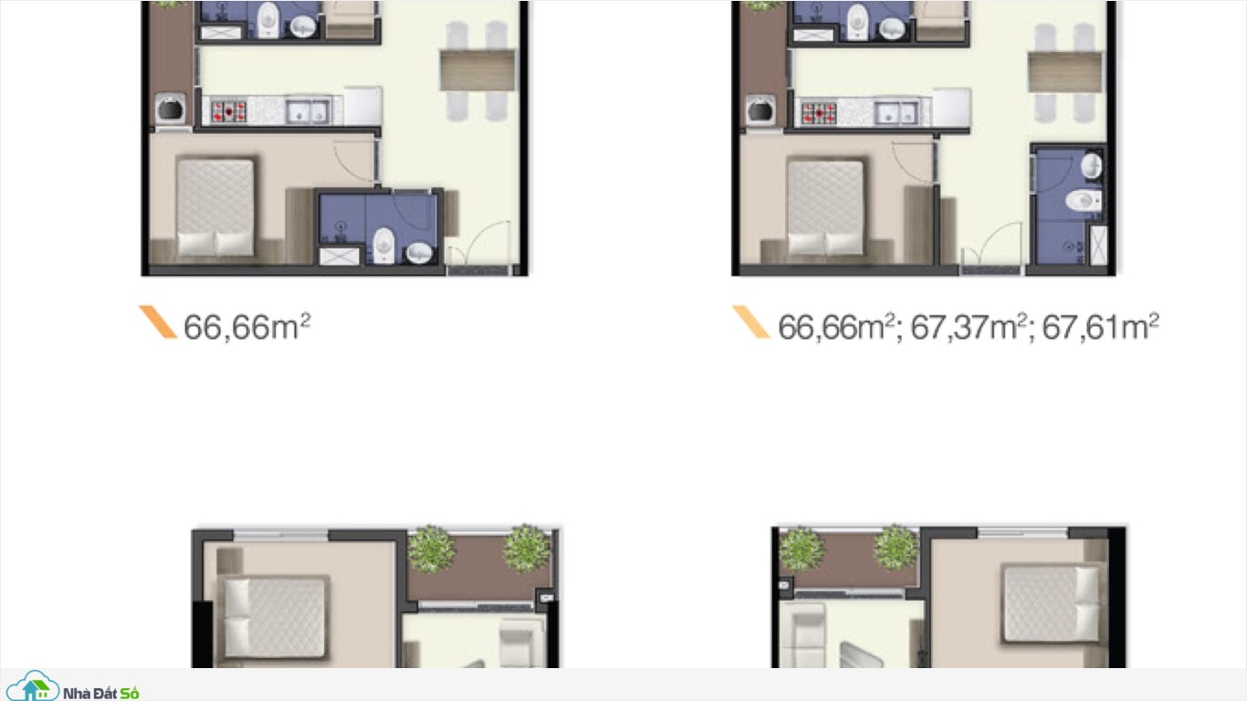 + 2 phòng ngủ: 66, 69, 73m2.