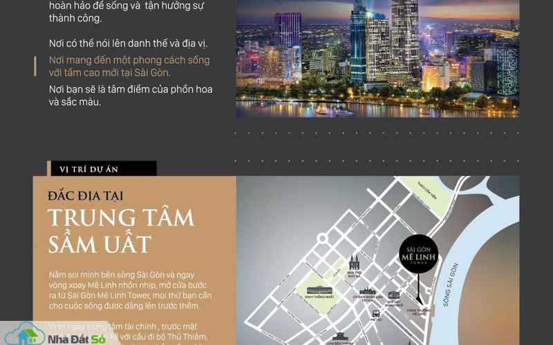 Ngoài ra, Sài Gòn Mê Linh nằm ngay cầu đi bộ bắc qua sông Sài Gòn kết nối với khu đô thị Thủ Thiêm. Từ vị trí dự án có tầm nhìn bao quát về trung tâm thành phố và về khu đô thị Thủ Thiêm. Có thể nói đây là dự án đang sở hữu view “vàng” đẹp bậc nhất Sài Gòn.